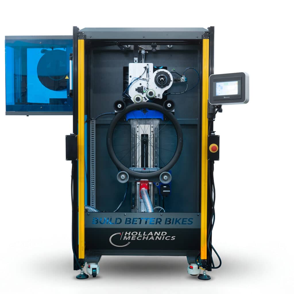 This new rim taping machine is designed for fast and flexible Tubeless rim tape application. It allows changeovers between specific profiles in just ~30 – 60 seconds, with a cycle time of 30 seconds per rim. It supports multiple tape spools, from 66m and 200m rolls up to 3000m, lowering change-over frequency and supports small and big batches. The Tubeles Taper also includes a heated valve hole puncture nozzle, ensuring a clean finish for any tape type. Lastly, it allows programmable tape overlay across the valve hole.